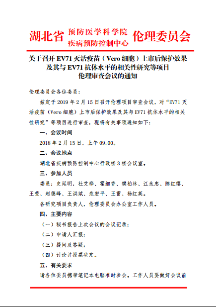 關于召開EV71滅活疫苗(Vero細胞)上市后保護效果及其與EV71抗體水平的相關性研究等項目倫理審查會議通知
