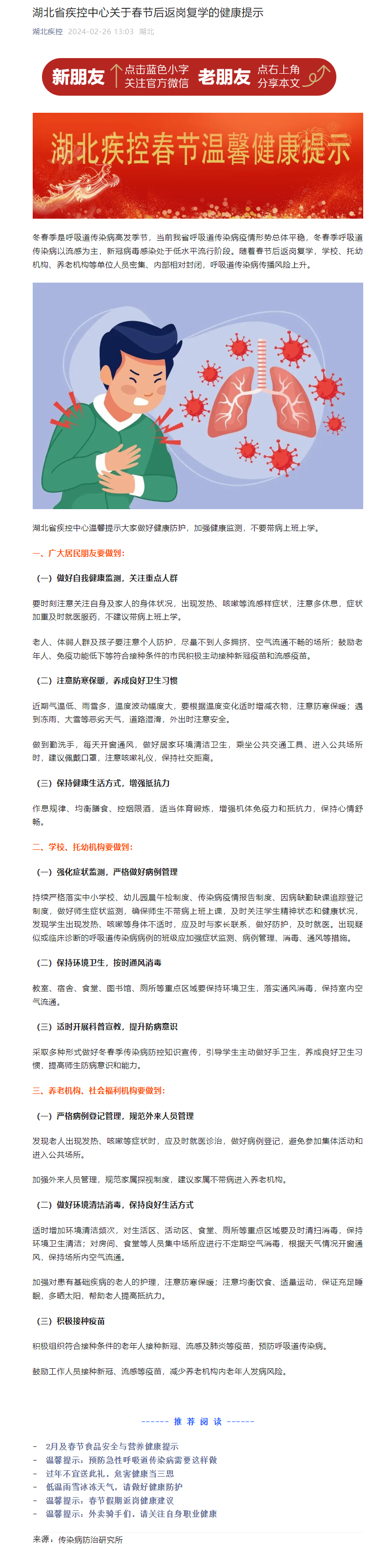 湖北省疾控中心關于春節后返崗復學的健康提示