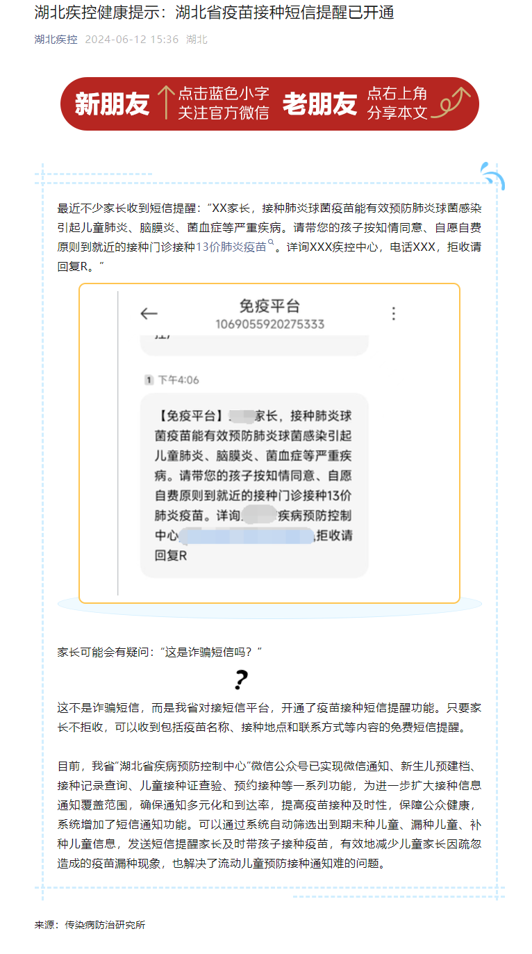 湖北疾控健康提示:湖北省疫苗接種短信提醒已開通