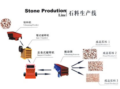 石料生產線基本工作流程: 先將石料通過喂料機,均勻的送進粗碎機進行初步的破碎;接著產生的粗物料由皮帶輸送機輸送到反擊式破碎機進行再一次的破碎,得到細碎后的石料進振動篩篩分出不同規(guī)格的石子,不滿足粒度要求的石子會返回反擊式破碎機再次被破碎,直到粒度合格。