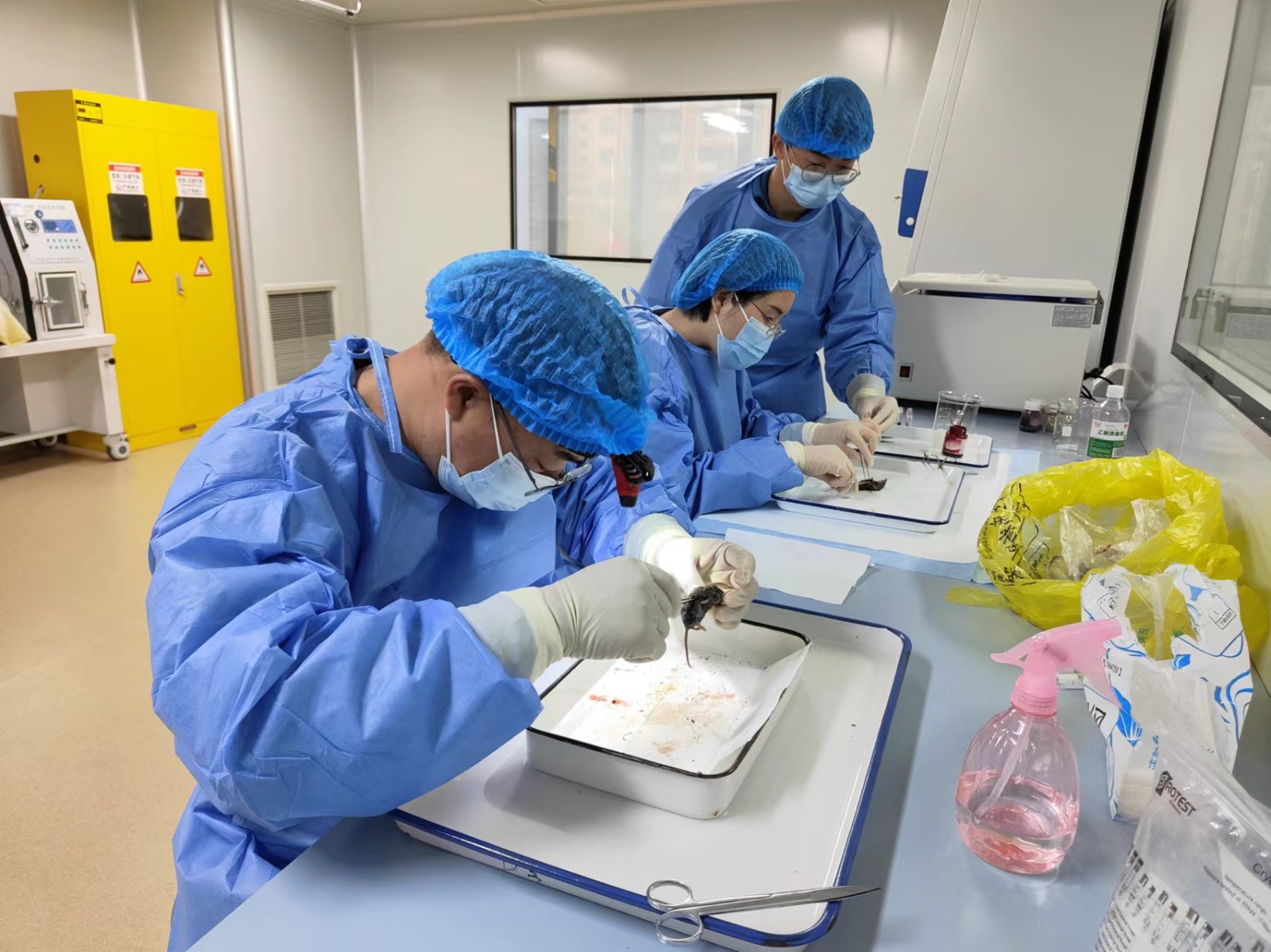 省市縣疾控中心人員綜合了英山縣斑疹傷寒和恙蟲病的報告發(fā)病率、地區(qū)海拔、地形地貌等因素,選擇了石頭咀鎮(zhèn)、紅山鎮(zhèn)及楊柳灣鎮(zhèn)部分村落作為現(xiàn)場調(diào)查點,進行鼠形動物密度調(diào)查、體表寄生蟲采集、解剖取樣等工作。鼠形動物密度調(diào)查采用夾夜法,通過查看野外的鼠洞、鼠跡,在鼠類出沒的地方以鮮肉為誘餌,布放鼠夾,晚放晨收。捕獲到的鼠形動物首先采集體表鼠蚤和恙螨等寄生蟲,再解剖摘取其肝、腎、肺等樣本,帶回省疾控中心實驗室做進一步的分類鑒定和病原學檢測。此次現(xiàn)場共采集鼠形動物120余只,大量鼠蚤和恙螨,將在4月完成分類鑒定,并開展恙蟲病東方體、莫氏立克次體、普氏立克次體、漢坦病毒、新型布尼亞病毒等病原體的核酸檢測工作。
